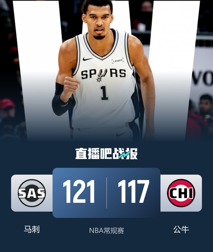 比赛开始,马刺反客为主打出13-4不错开局,公牛连续内线追分,但马刺多点开花回应,文班亚马直接填满数据栏,首节马刺领先8分,次节双方继续对攻,福克斯接连突破取分,文班外线也开和,但公牛全员找回手感给出回应,并在半场反超1分。下半场,双方继续拉锯战,公牛投手们纷纷发力,道苏姆撑起替补席单节得分近乎上双,三节公牛领先到9分,末节公牛进攻端受阻,文班亚马里突外投很快上双,最后时刻又两记三分反超比分,许尔特关键三分不中,最终马刺121-117险胜公牛,拿到3连胜同时送对手3连败。