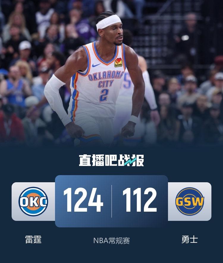 首节对决勇士早早进入状态迅速抢占主动,整节虽然优势不算大但进攻火力凶猛单节攻下32分;勇士方面首节进攻发挥尚可但次节状态迅速回落仅得18分,雷霆则以一波21-9的攻势迅速拉开两位数分差奠定半场19分的领先,勇士祸不单行巴特勒左膝受伤并退出下半场的比赛。休息归来勇士以攻代守掀起进攻高潮,他们节中送出15-3的攻势蚕食分差,这一节他们狂轰44分并在第四节实现反超;关键时刻雷霆顶住压力,亚历山大一内一外拿下关键5分,雷霆以一波7-0的攻势重新确立优势奠定胜局。最终,雷霆击败勇士豪取13连胜。