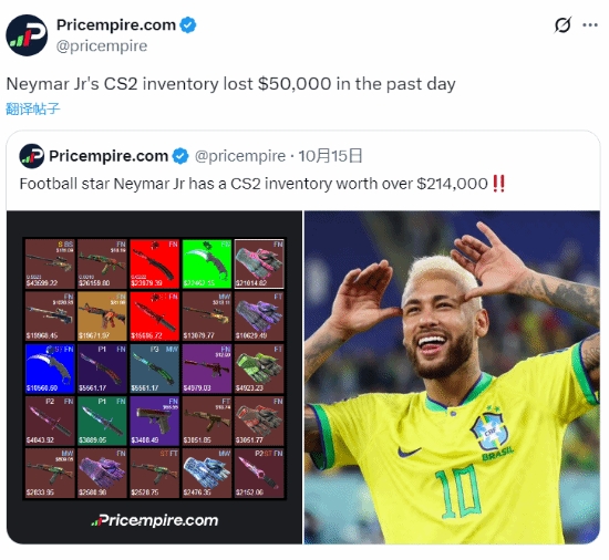 热爱CS2的巴西球星内马尔也未能幸免,据PriceEmpire披露,内马尔原本超过20万美元的个人《CS2》饰品库存,仅在过去24小时内就缩水约5万美元。