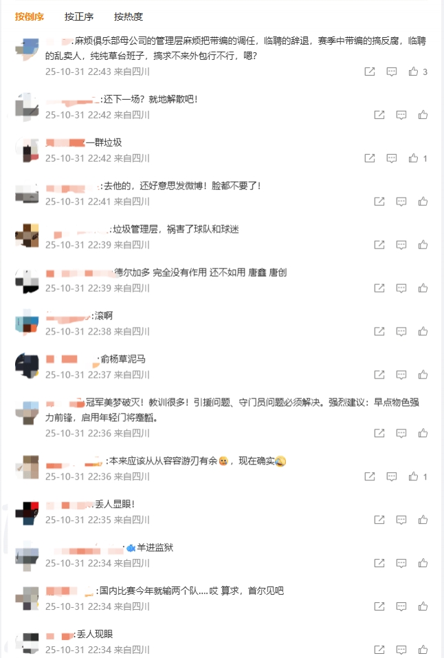 10月31日讯 中超第29轮,蓉城1-2遭河南逆转,剩1轮落后4分退出争冠。比赛结束后,大量蓉城球迷涌入球队官博评论区表达不满。