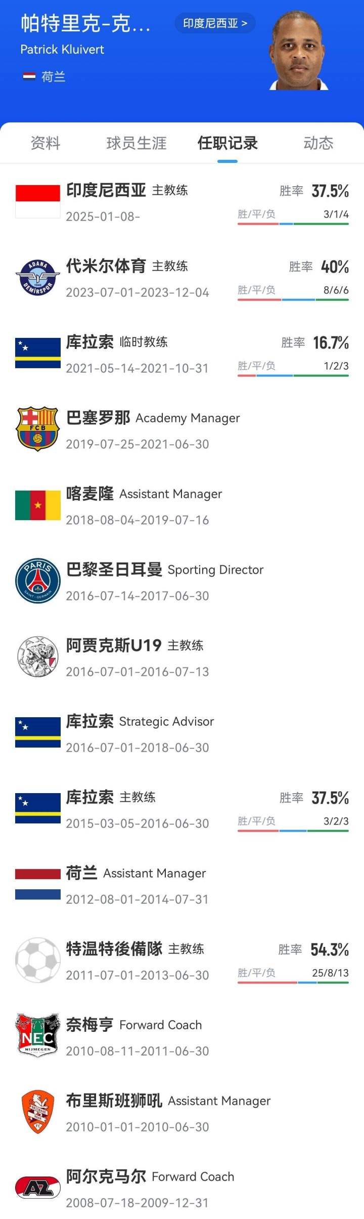 克鲁伊维特现年49岁,球员时代他是足坛最优秀的射手之一,曾效力阿贾克斯、AC米兰、巴萨等队,退役后曾担任喀麦隆助教、库拉索代理主帅。他执教印尼前唯一一段正式主帅经历是2023年7月起担任土超代米尔体育主帅,20场比赛8胜6平6负,执教5个月便下课。克鲁伊维特还担任过荷兰国家队主帅范加尔的助教,帮助球队在2014年巴西世界杯获得季军。