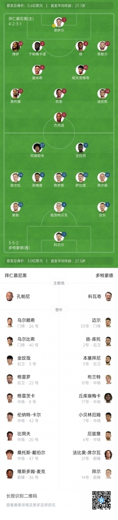 多特蒙德替补:33-迈尔、2-扬·库托、5-本塞拜尼、6-厄兹詹、7-小贝林厄姆、10-布兰特、17-丘库埃梅卡、14-拜尔、21-法比奥·席尔瓦